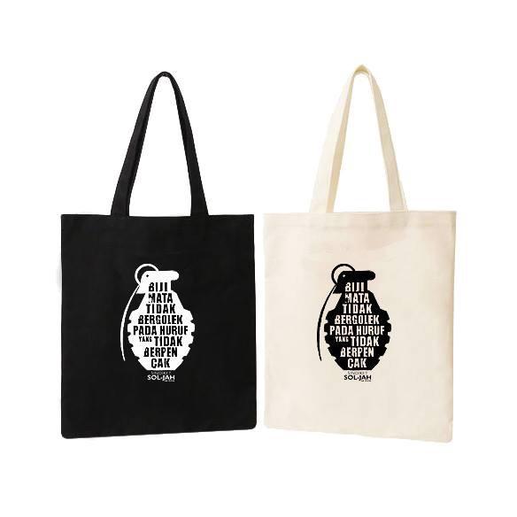 Tote bag pertama Sindiket Sol-jah. Terdapat dua pilihan iaitu logo Sindiket Sol-jah atau Biji Mata Tidak Bergolek pada Huruf Yang Tidak Berpencak.